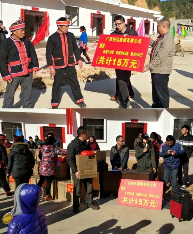 当天,新寨中充满了欢声笑语,处处洋溢着喜庆的气氛,集团为表示对入住村民的祝福和问候,实地赠予新寨村民们130套床、65套电磁炉、280斤猪肉,共计15万元人民币。
