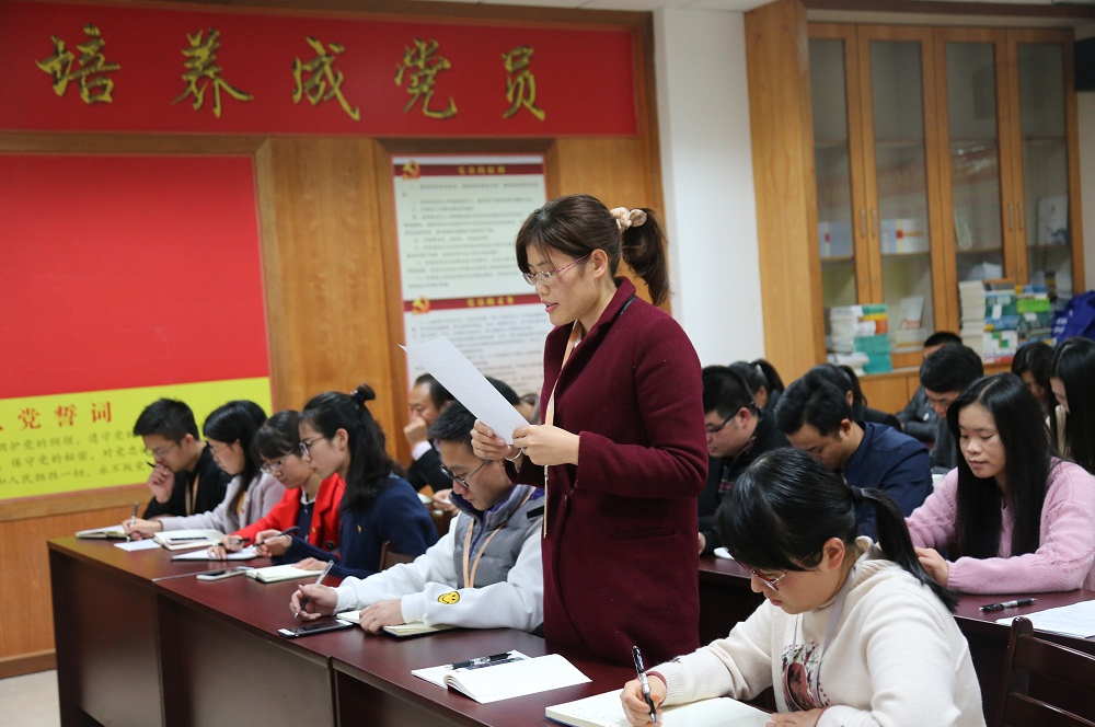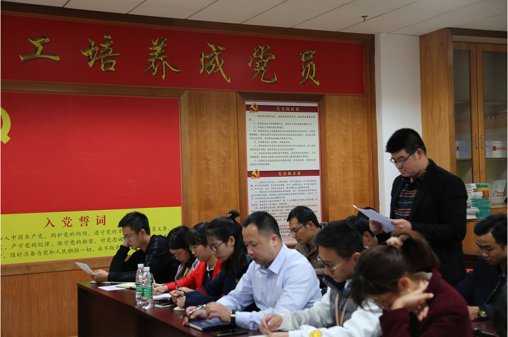 会议第一项议程为讨论票决权芬、杨峰两名同志预备党员转正事宜。两名预备党员向大会汇报个人在预备期间的个人情况等,随 后,支部委员会对两名预备党员在预备期间的教育和考察情况,提出能否转为正式党员的意见,两名入党介绍人及其他与会党员就两名同志在预备期间的表现发言个人意见。经过充分讨论,大家一致认为,两名同志具备了一名正式党员的条件,一致同意其转正,通过民主投票表决,全票通过了两名预备党员转为正式党员的决定。会议进行第二项议程为讨论票决吸收杨硕、黄雄光两名同志为预备党员。按照发展党员的程序要求,两位发展对象分别向大会汇报各自的入党动机、对党的认识、个人表现等,并表达了加入中国共产党的强烈愿望,党支部书记谢家伟代表支部报告了两位同志的考察情况,入党介绍人分别就两位同志在培养考察阶段中各方面的表现发表意见,与会党员进行了充分讨论,大家一致认为,两位同志各方面的表现都符合一名党员的标准,大会最后投票表决,全票通过接纳两位同志为中共预备党员。