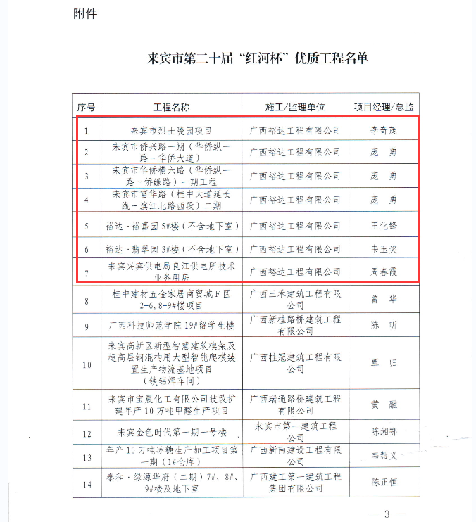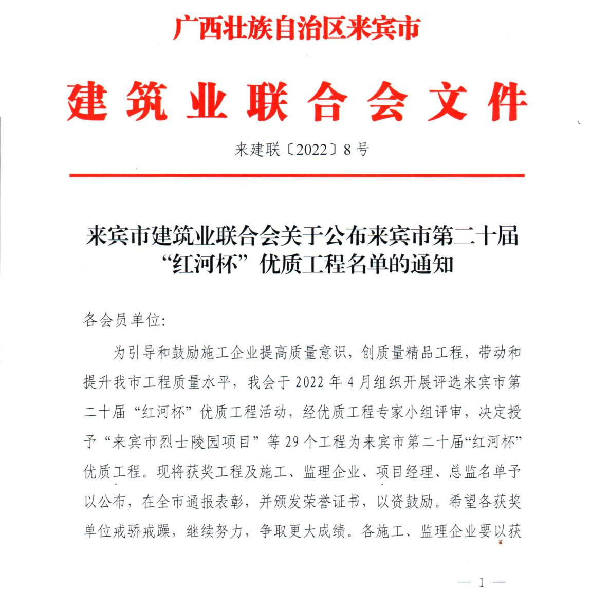 5月10日,来宾市建筑业联合会印发《关于公布来宾市第二十届“红河杯”优质工程名单的通知》,华体会官方网页版承建的来宾市烈士陵园项目、裕达•裕嘉园5#楼(不含地下室)、裕达•翡翠园3#楼(不含地下室)等共8个项目荣获来宾市第二十届“红河杯”优质工程奖。