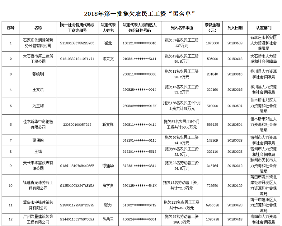 建立和实施拖欠农民工工资“黑名单”制度,加大对拖欠工资违法失信行为的惩戒力度,是保障农民工工资支付的一项重要举措,是推进企业工资支付诚信体系建设的重要内容,也是健全源头预防、动态监管和失信惩戒相结合的工资支付制度保障体系的重要手段。为此,2017年9月,我部专门制定印发了《拖欠农民工工资“黑名单”管理暂行办法》,于今年1月1日起施行。2017年11月,我部又与发展改革委、人民银行、住房城乡建设部等30个部门和单位联合签署印发了《关于对严重拖欠农民工工资用人单位及其有关人员开展联合惩戒的合作备忘录》。各地人社部门结合本地实际,制定出台相关实施细则,依法开展拖欠农民工工资“黑名单”认定工作,并实行跨部门联合惩戒。近期,我们在各地提供情况的基础上,梳理了第一批拖欠农民工工资“黑名单”,共涉及14家违法企业和6名违法人员,今天在此将这些违法企业和个人向全社会予以公布。