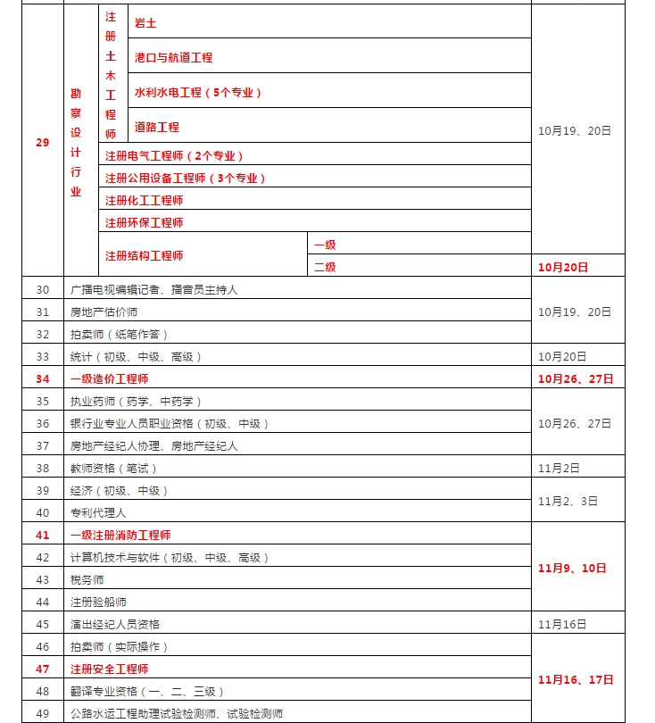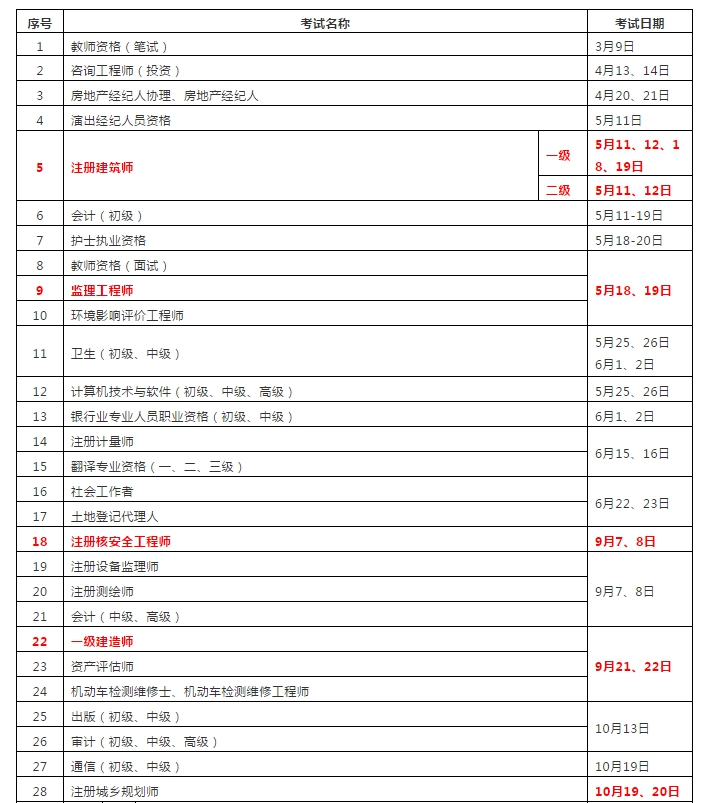 20181220日,人力资源社会保障部发布《关于2019年度专业技术人员资格考试计划及有关事项的通知》,一级建造师、一级造价工程师、注册建筑师、监理工程师、注册土木工程师、注册结构工程师等在列。相比2018年,2019年一级建造师、注册建筑师考试时间推迟了一周。