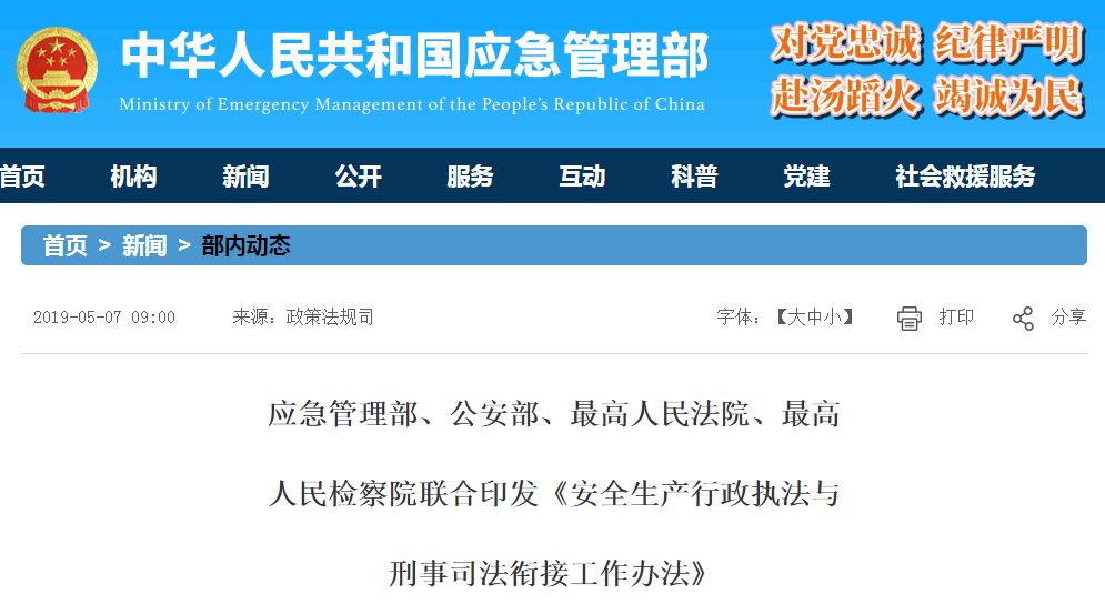 应急管理部 公安部 最高人民法院 最高人民检察院关于印发《安全生产行政执法与刑事司法衔接工作办法》的通知