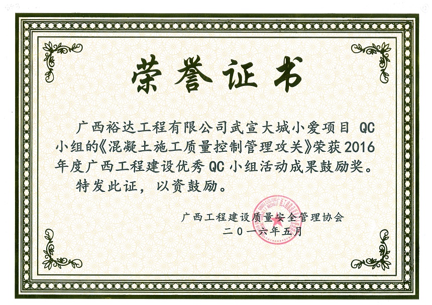 2016年度广西工程建设优秀QC小组活动成果鼓励奖《混凝土施工质量控制管理攻关》-武宣大城小爱项目
