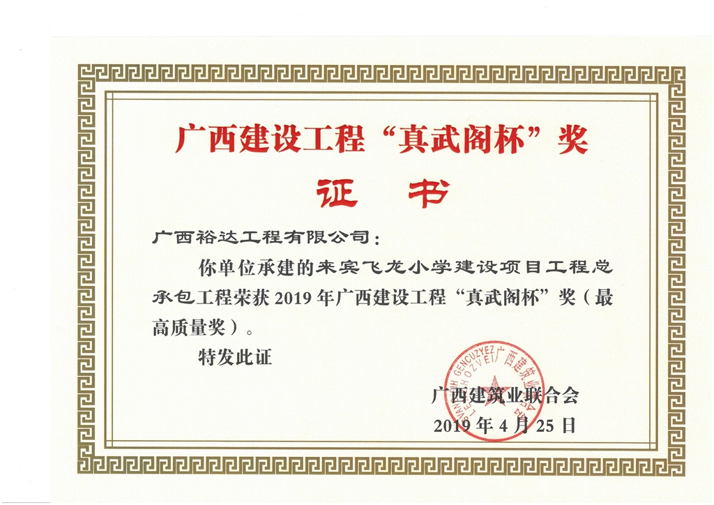 来宾飞龙小学建设项目工程总承包荣获2019年广西建设工程“真武阁杯”奖(最高质量奖)