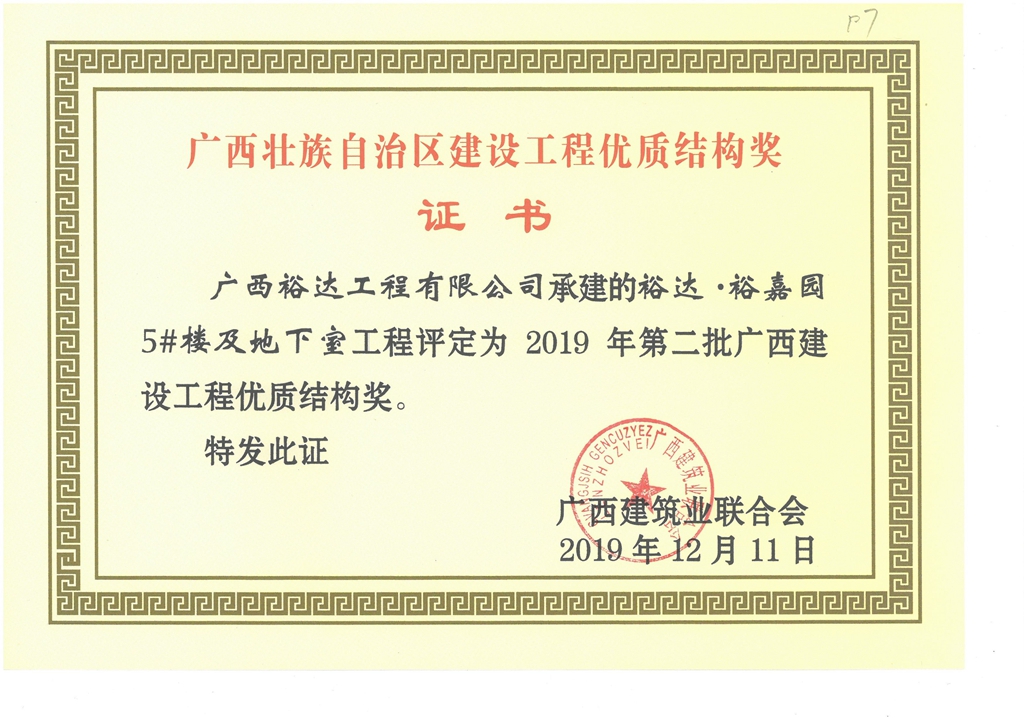 裕达·裕嘉园5#楼及地下室工程评定为2019年第二批广西建设工程优质结构奖